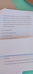 3. That to enhance effective governance at Northern Senatorial District, the entire Cross River State and Nigeria at large, and in the realisation of the President’s bold economic reforms that are repositioning the country positively, we the Bakor Nation do hereby endorse the Presidential of the Federal Republic of Nigeria, Senator Asiwaju Bola Ahmed Tinubu (GCFR) for a second term as Presidents as of the Federal Republic of Nigeria. We hereby pledge our total and unalloyed to the trio and Federal Republic of Nigeria.