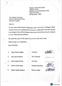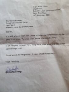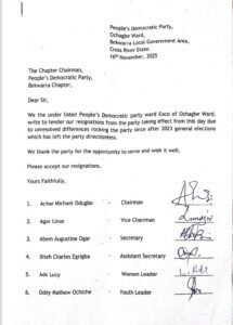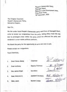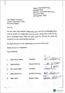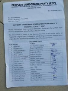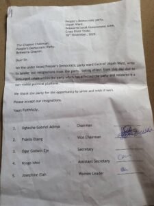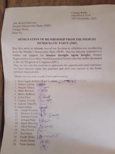 Members of the Peoples Democratic Party (PDP) across the 5 Local Government Areas of Cross River North have tendered their resignation letters to the PDP in preparation to join the ruling All Progressives Congress (APC).