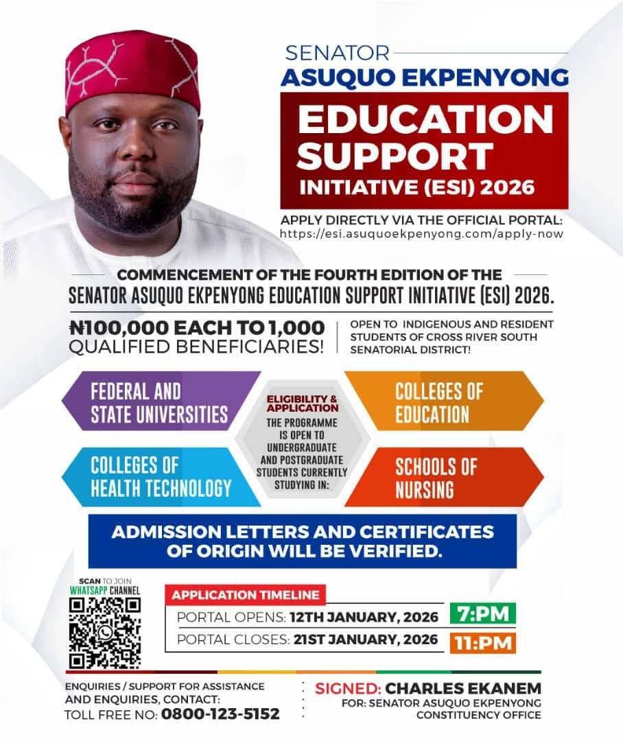 The release indicates that “Constituency Office of Senator Asuquo Ekpenyong is pleased to announce the commencement of the Fourth Edition of the Senator Asuquo Ekpenyong Education Support Initiative (ESI) 2026.