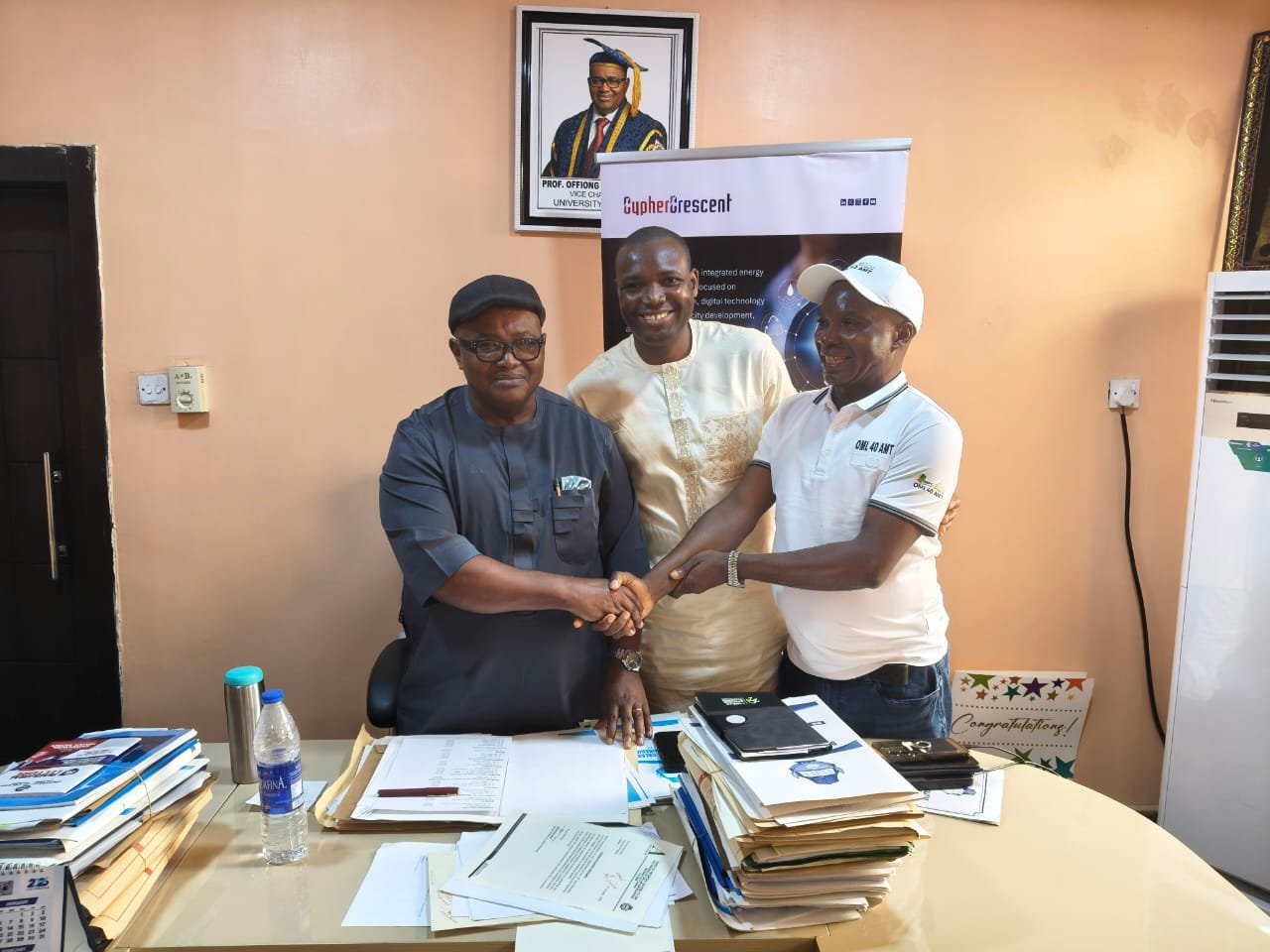 Prof Offiong made the call on Thursday 29th of January, 2026 when the former Dean of the Faculty of Engineering, Prof Odey Osha, led Dr Oli Olowhu and CypherCrescent team on a courtesy call to the Vice Chancellor.